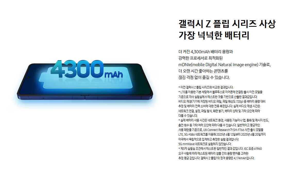 기존 Z플립 시리즈의 단점이었던 배터리 용량 사용시간을 대폭 늘려서 사용자의 편의성을 높였습니다.