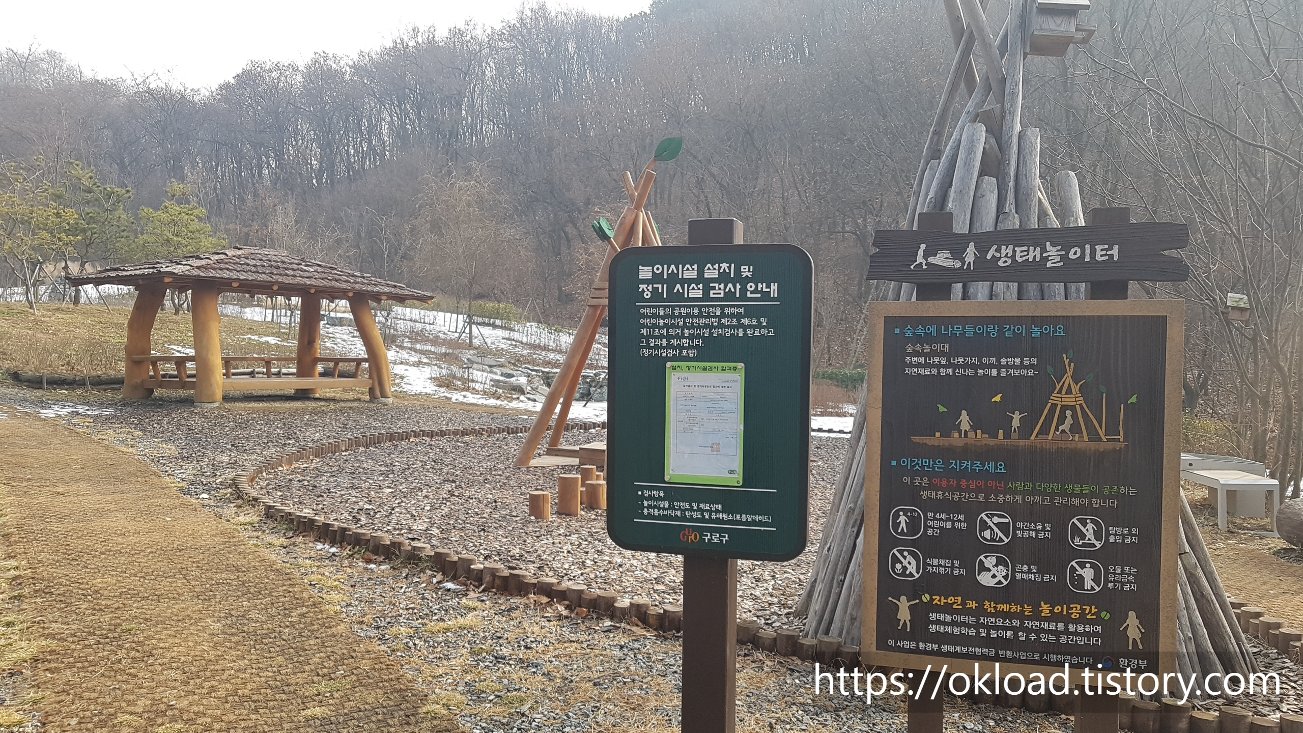 위 사진에서 보여지는 것처럼 천왕자연공원 안의 놀이터는 다양하고 화려하지는 않지만, 자연에서 구해진 원목 나무만을 최소한으로 사용하여 놀이공간을 마련돼있다.