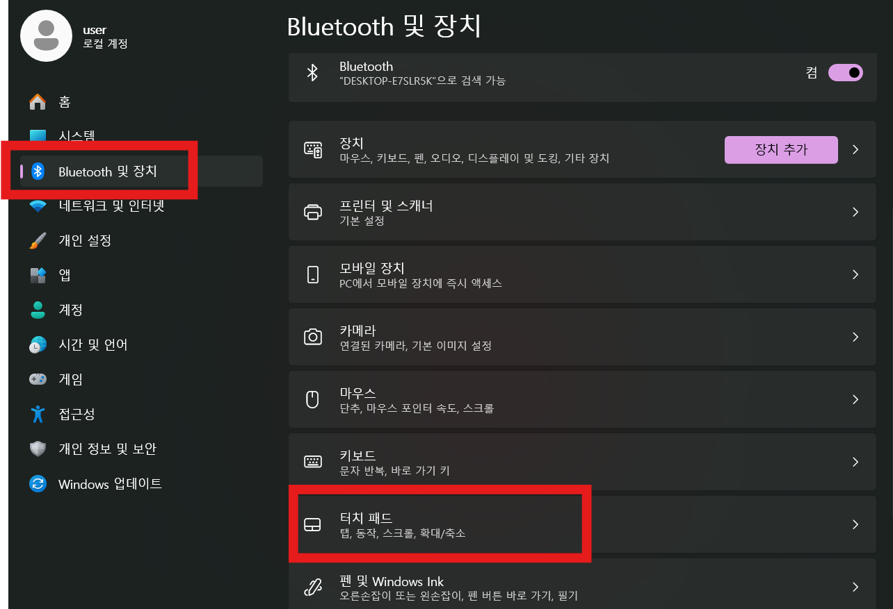 여기서 '블루투스 및 장치' 카테고리로 들어간 후 하위메뉴 중 '터치패드'항목을 클릭합니다!