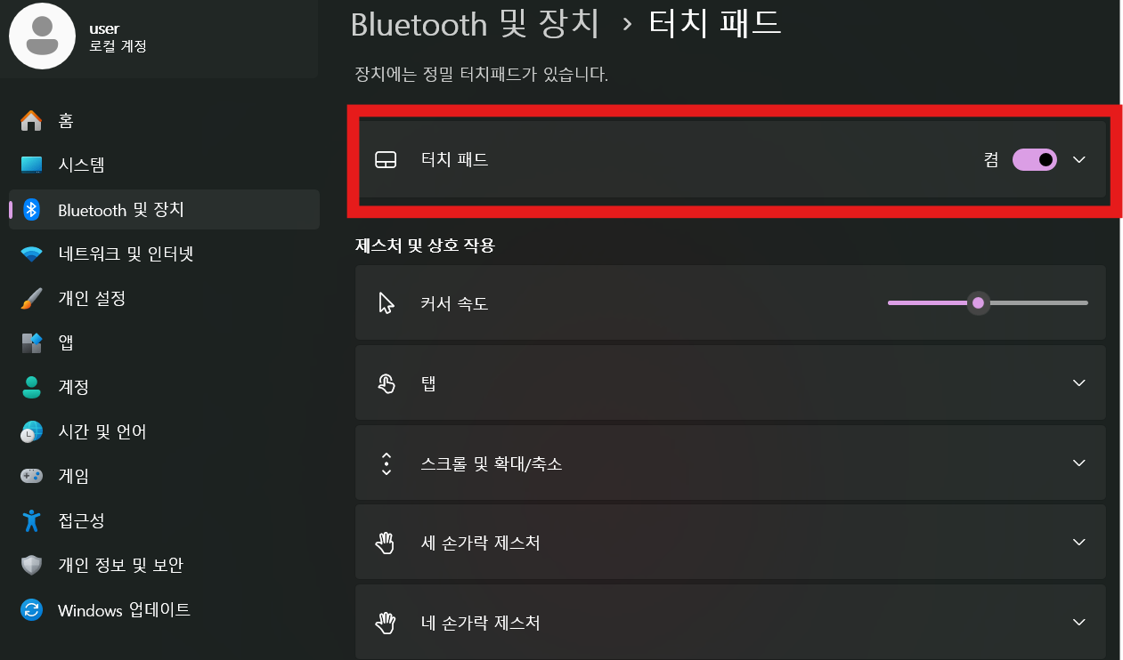 'Bluetooth 및 장치' - 터치패드 메뉴까지 이어서 잘 들어갔다면, 위 화면과 같은 메뉴가 나옵니다.