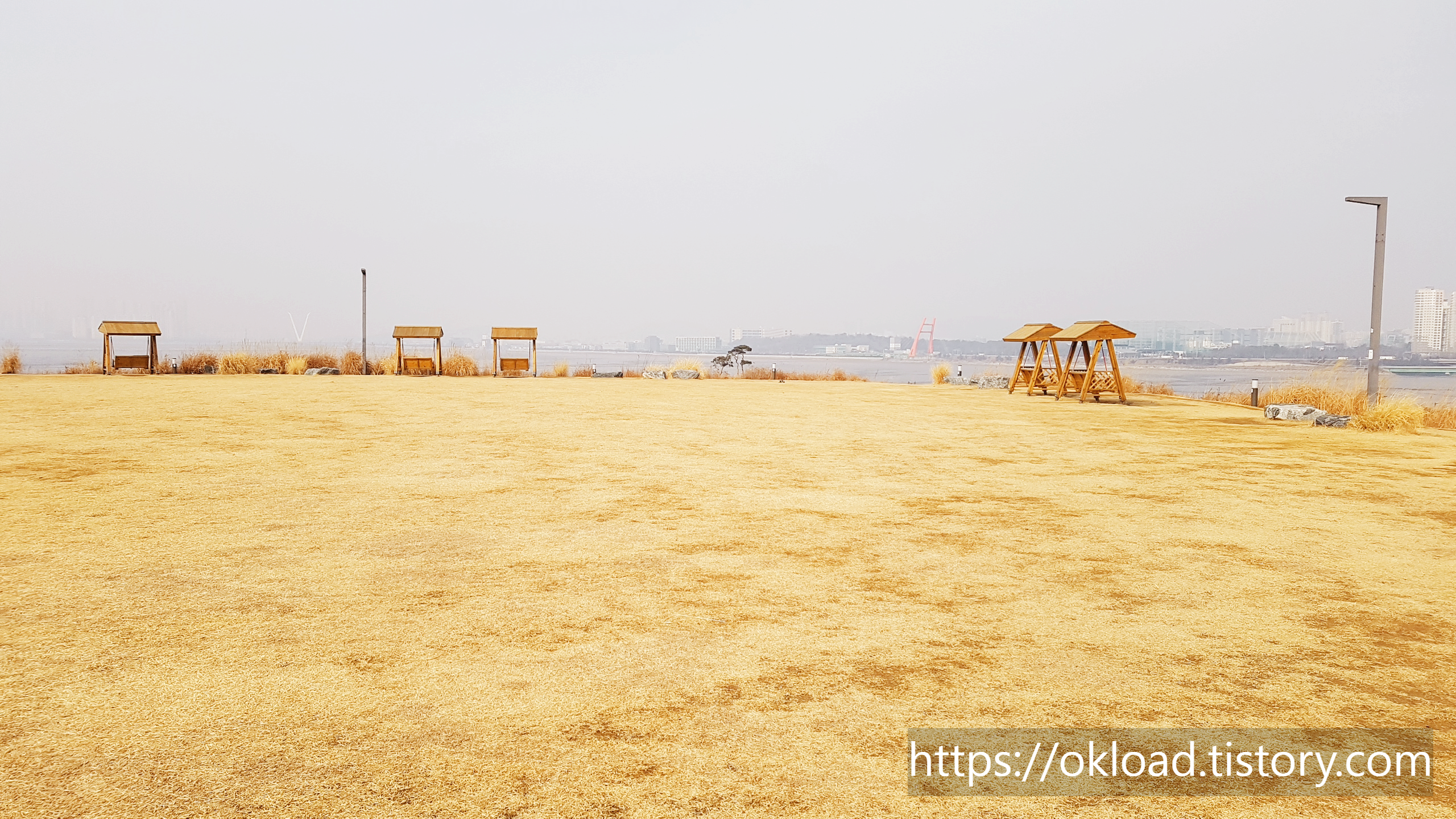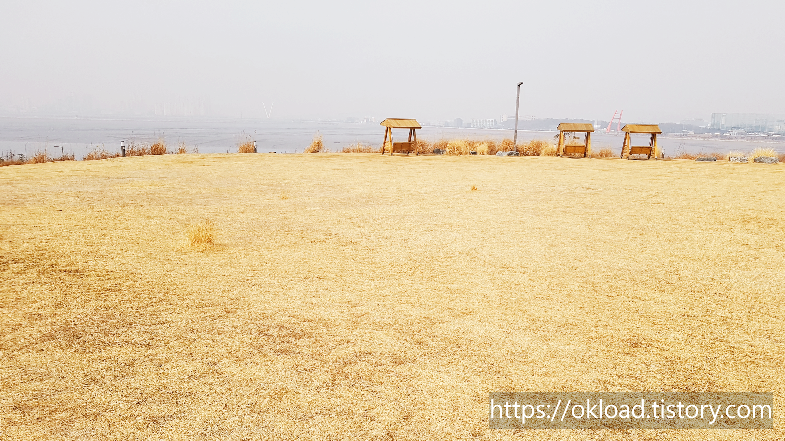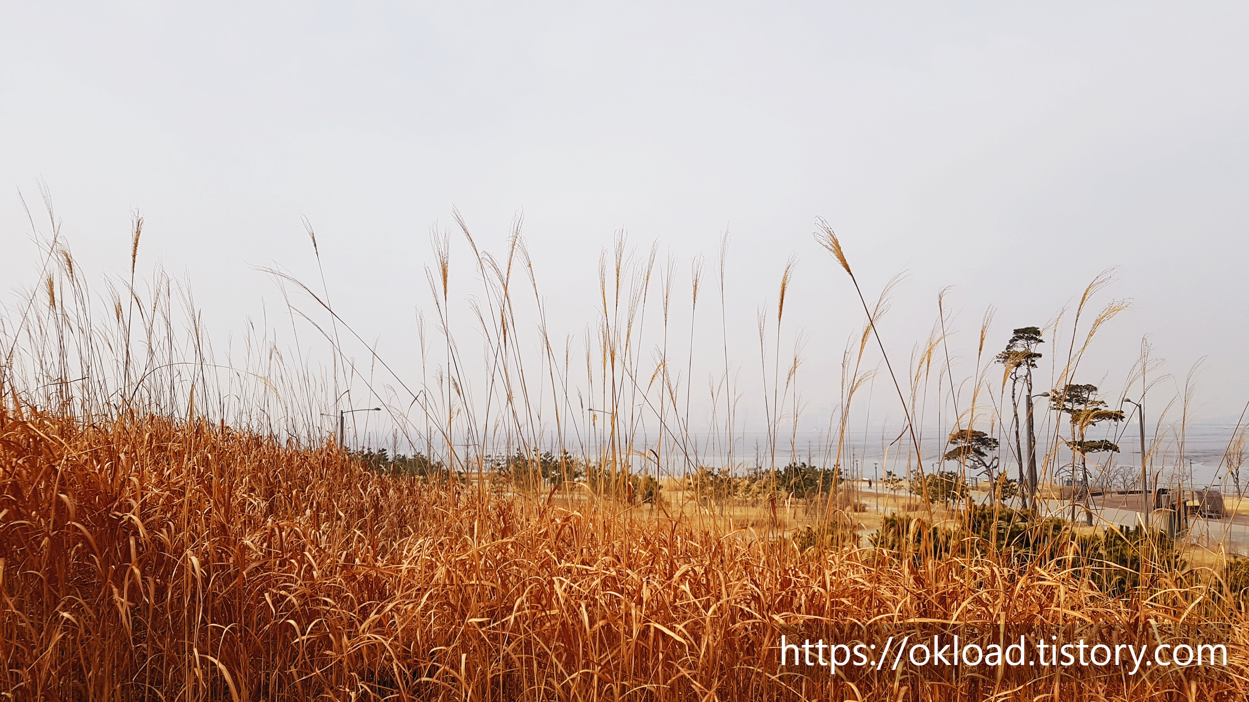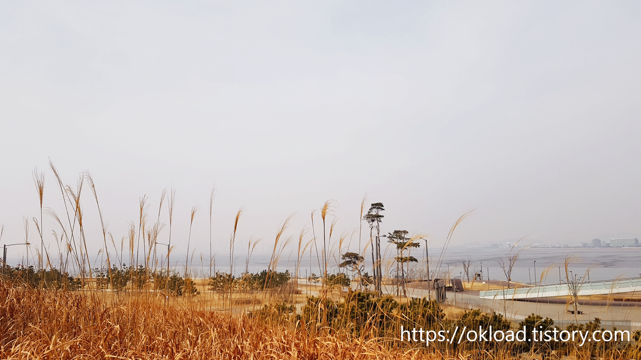 갈대들 뒤편으로, 육교가 보이고, 육교 뒤로는 바다와 송도까지도 보인다. 다소 흐린 날이라서 시야가 탁한 편이었는데, 화창한 날에는 바다와 하늘이 맞닿는 아름다운 수평선을 감상할 수도 있다.