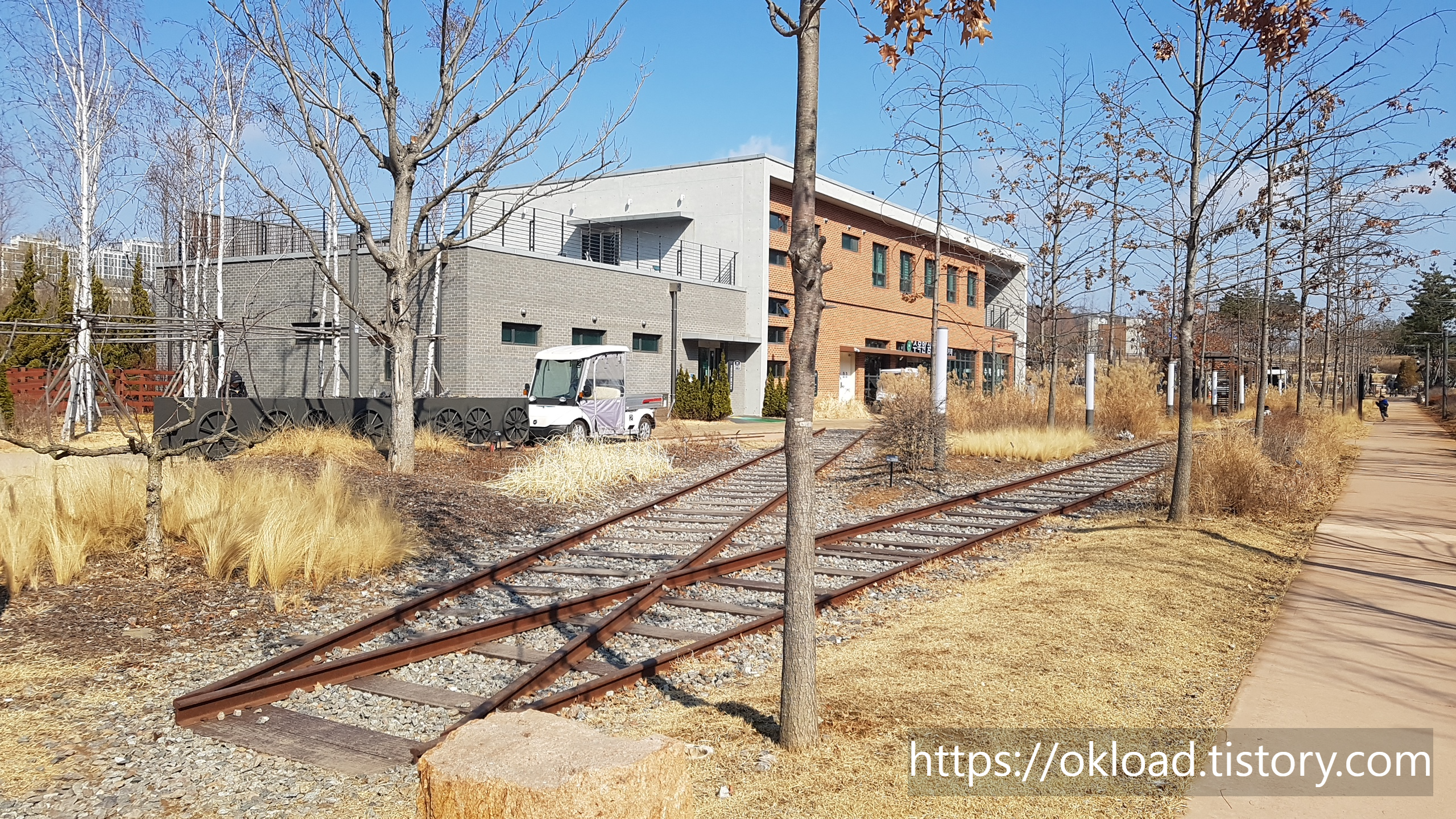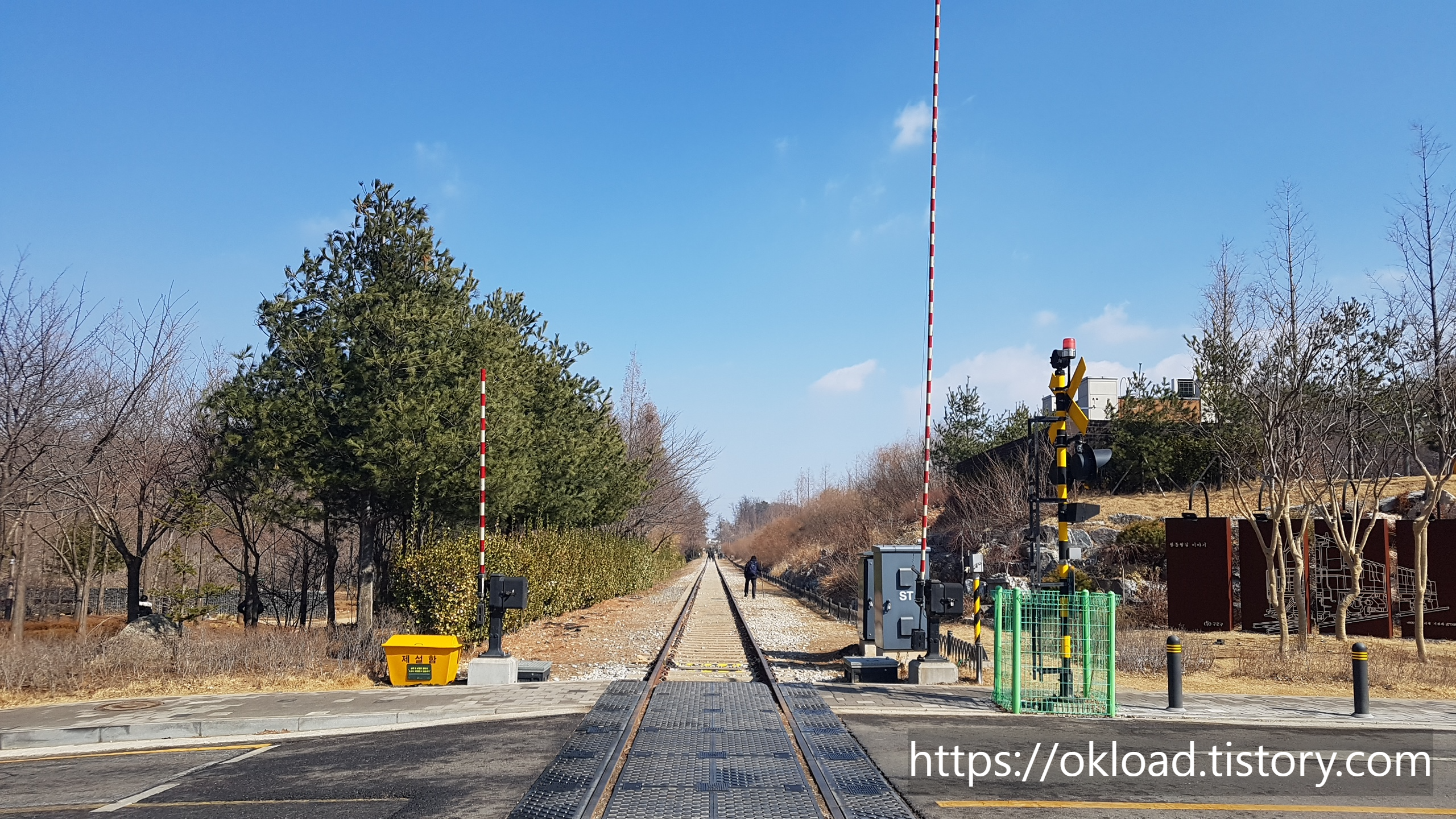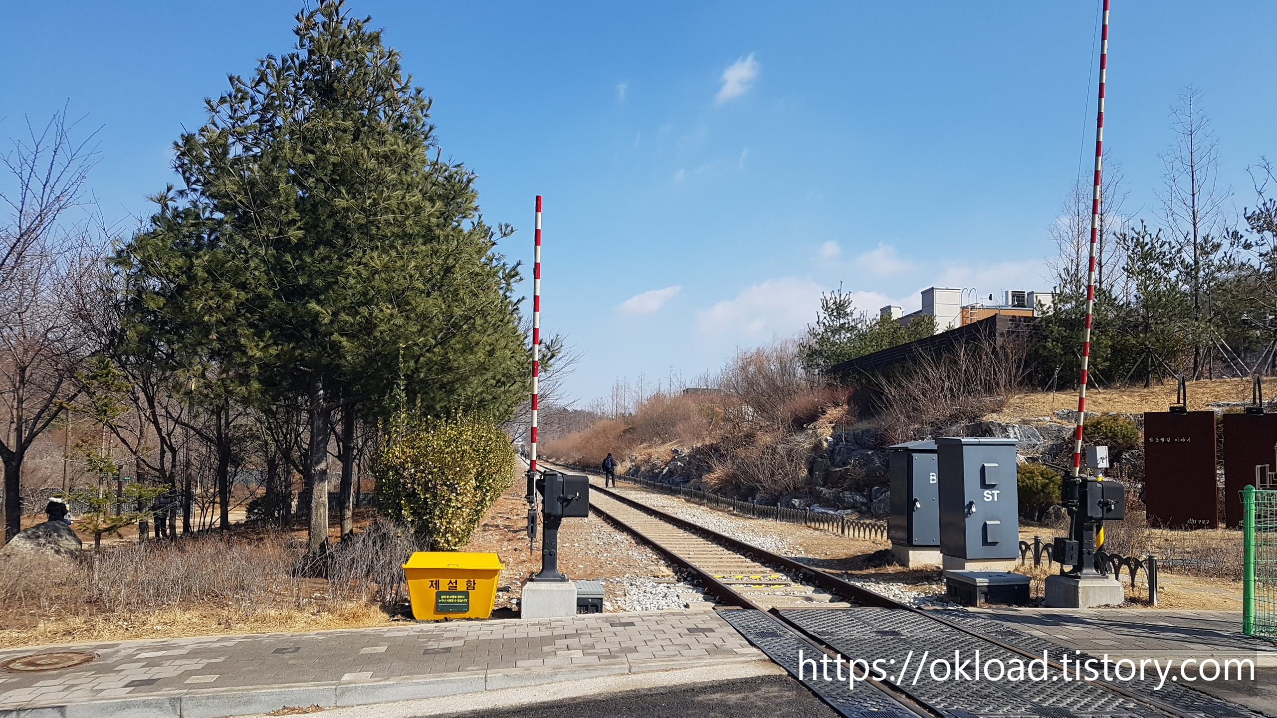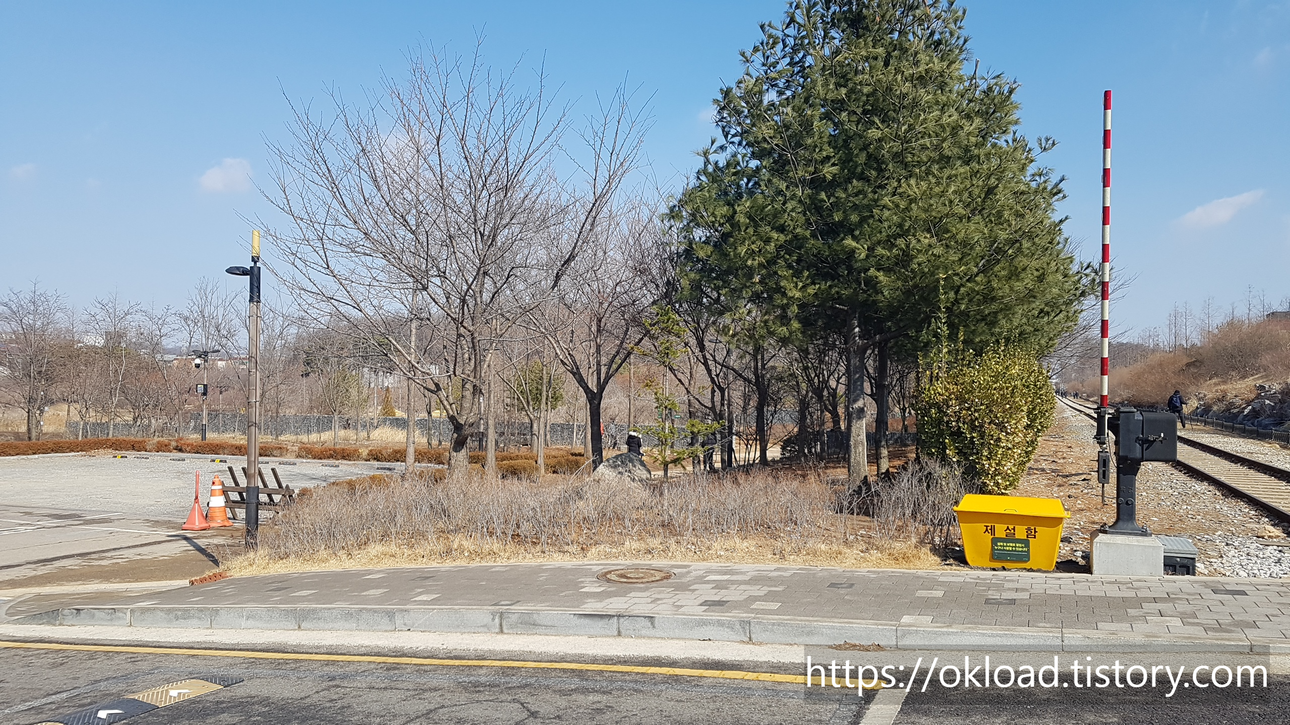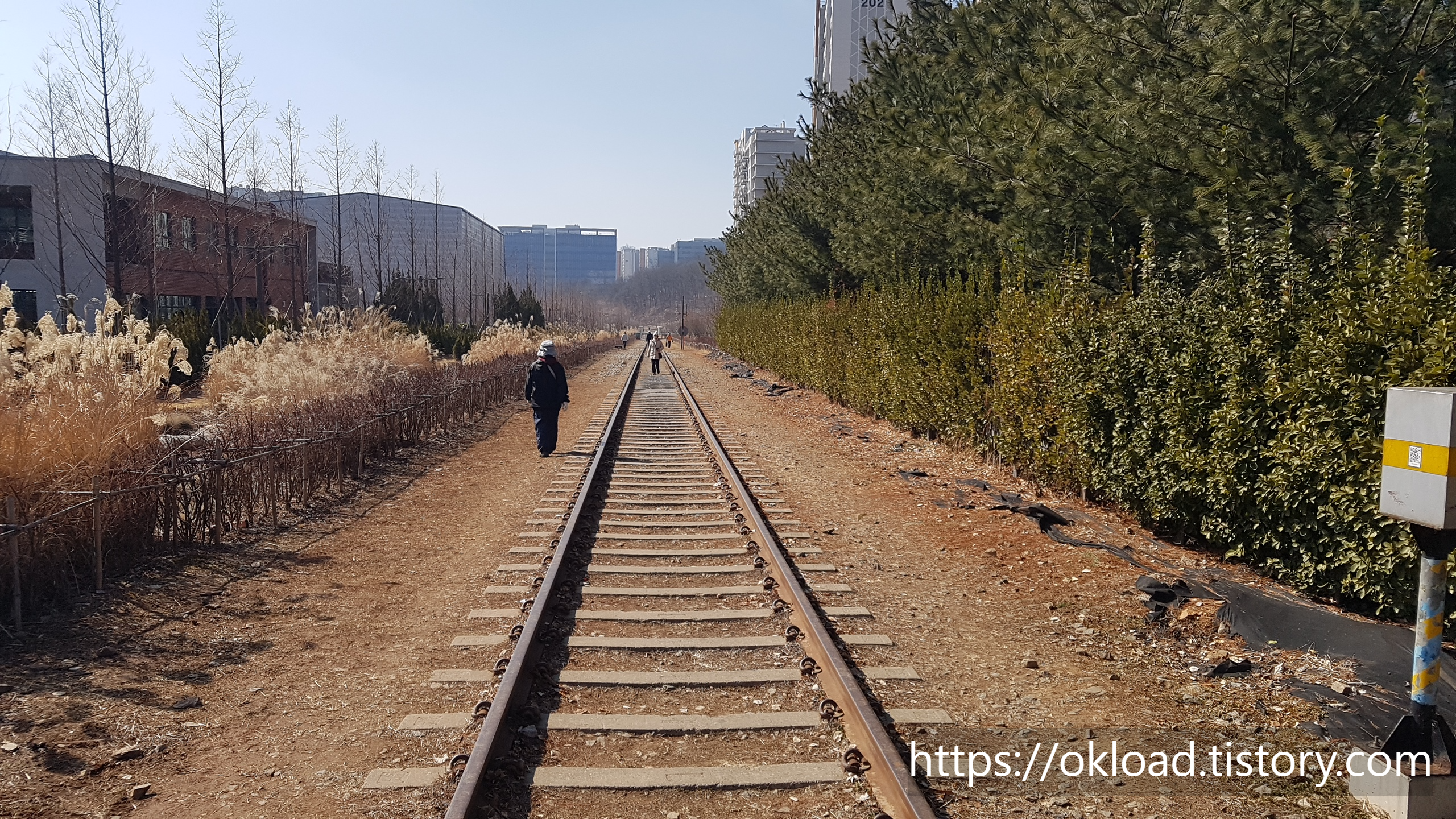 좌측으로 보이는 공터가 항동 푸른수목원 정문 주차장이다. 그리고 우측으로 보이는 기찻길이 항동철길이다. 이처럼 주차장에서 항동 기차길과 푸른수목원 접근성이 매우 우수한 주차환경이다.