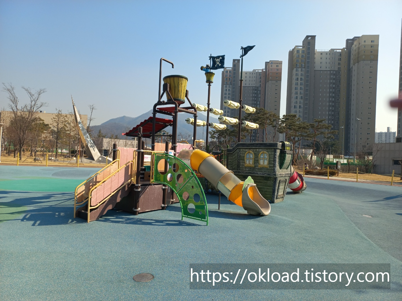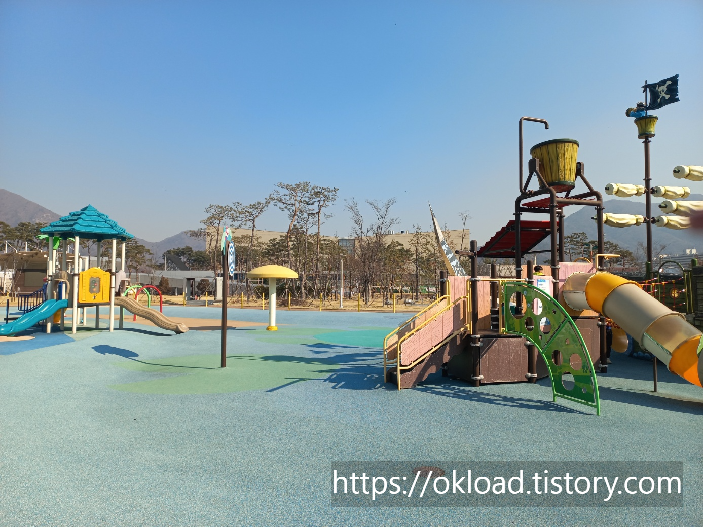 워낙 넓은 부지의 한가운데 만들어진 놀이터(물놀이장)이기 때문에 사진상으로는 다소 놀이터 규모가 작아 보이기도 하는데, 일반적인 신축 아파트 단지 내 놀이터 보다도 놀이기구가 크고 다양한 편이다.
