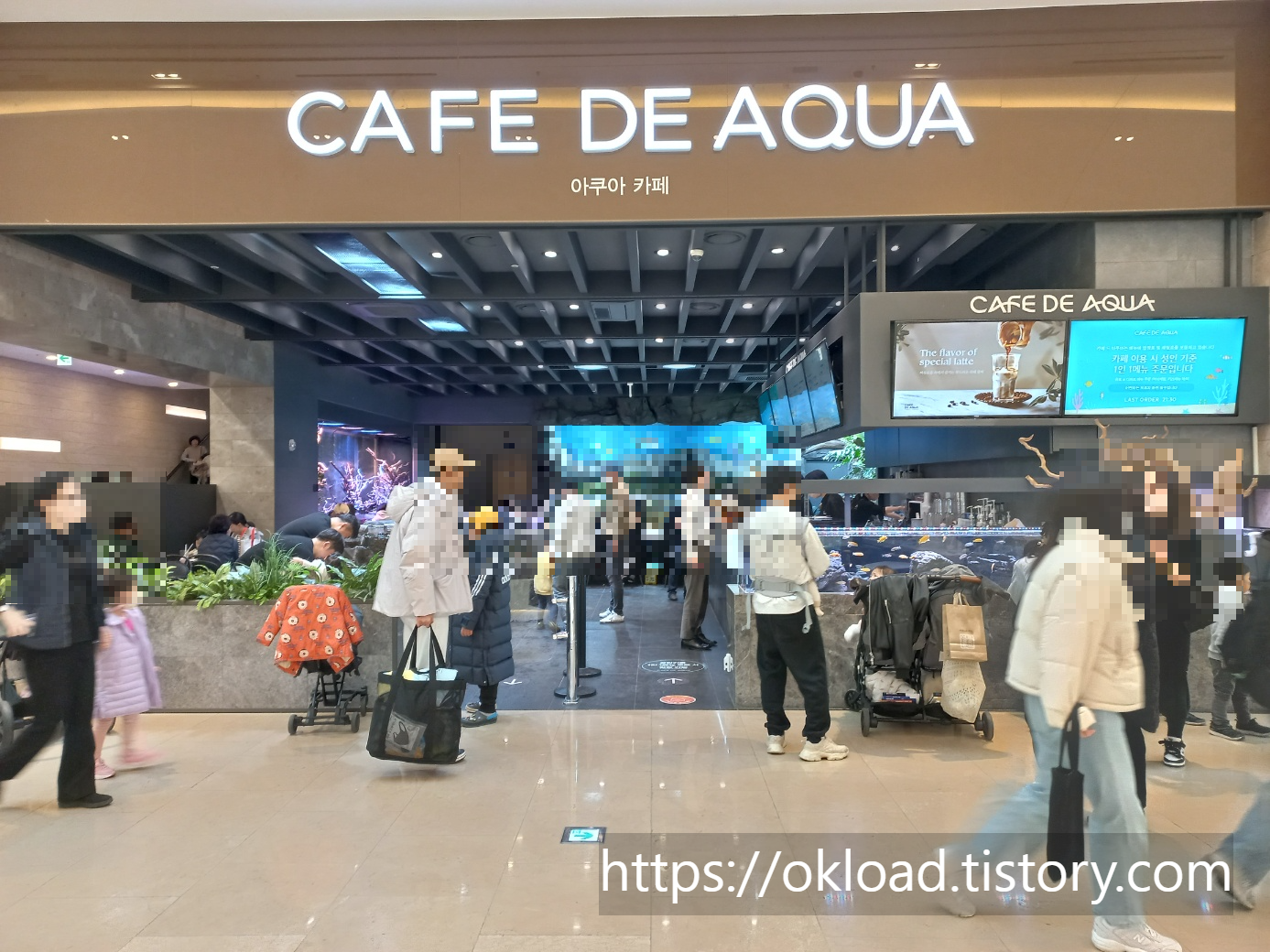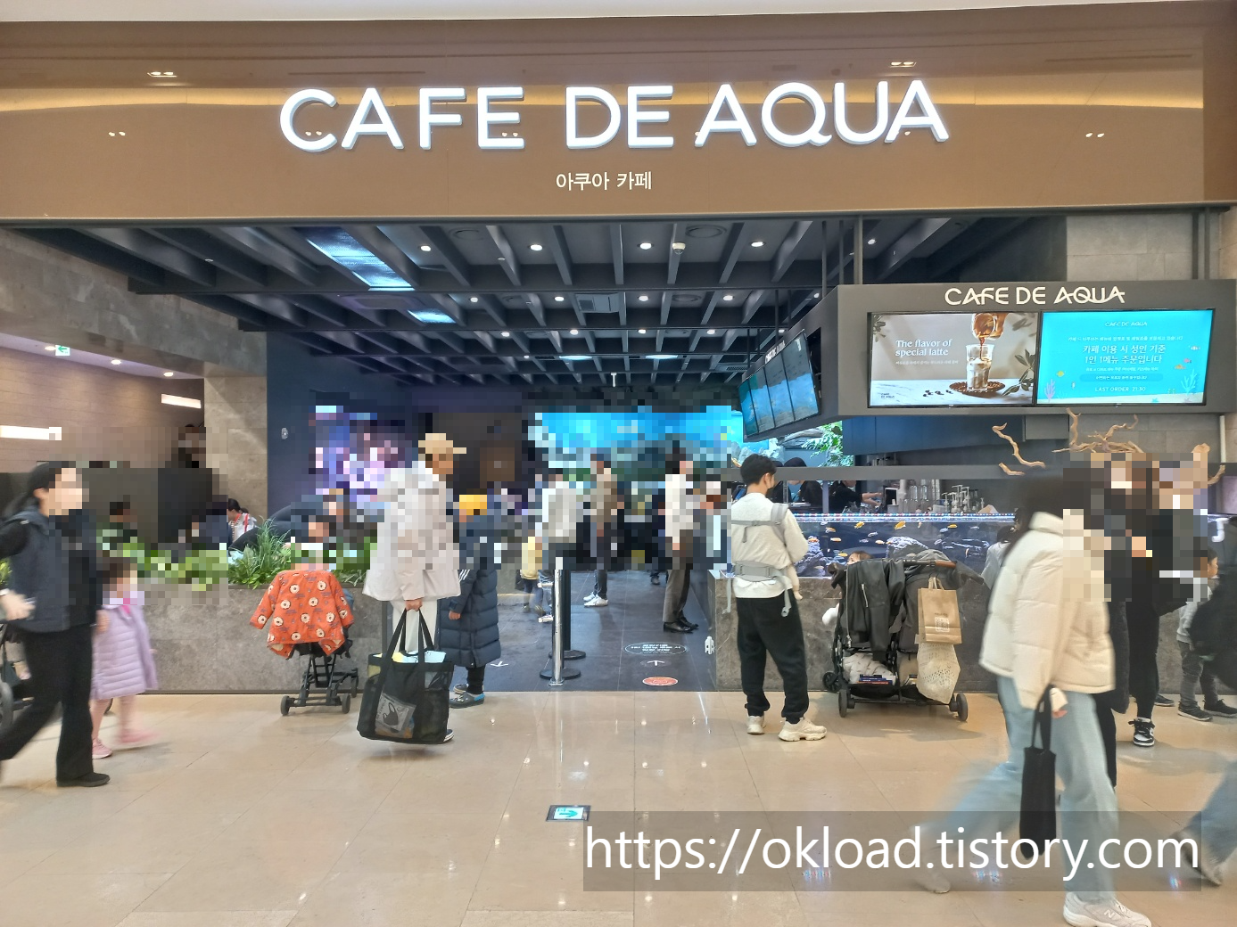 사실 카페 아쿠아 입장을 위해서 대기하는 사람들이 워낙 많아서 다음 기회로 미루려 하였으나, 아이가 너무도 들어가고 싶어하여 일단 웨이팅 무리에 줄을 서고 기다렸다.